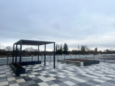 Auf der Terrasse der Palliativpatienten sind bereits die Pflanztröge und die Pergola mit Sitzgelegenheiten für die Patienten aufgestellt.