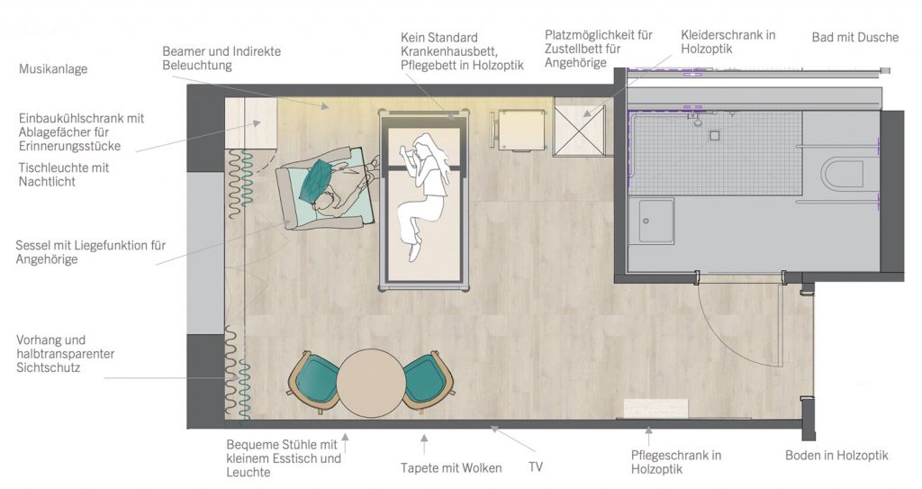Für die Palliativstation der München Klinik Harlaching wurde ein Gestaltungskonzept entwickelt, das den Menschen in seiner Gesamtheit wahrnimmt: mit seinen Ängsten, seiner Verletzlichkeit, aber auch mit seinem Wunsch nach Ruhe, Nähe und Würde. Patienten, Angehörige sowie das Pflege- und Ärzteteam stehen dabei gleichermaßen im Mittelpunkt.